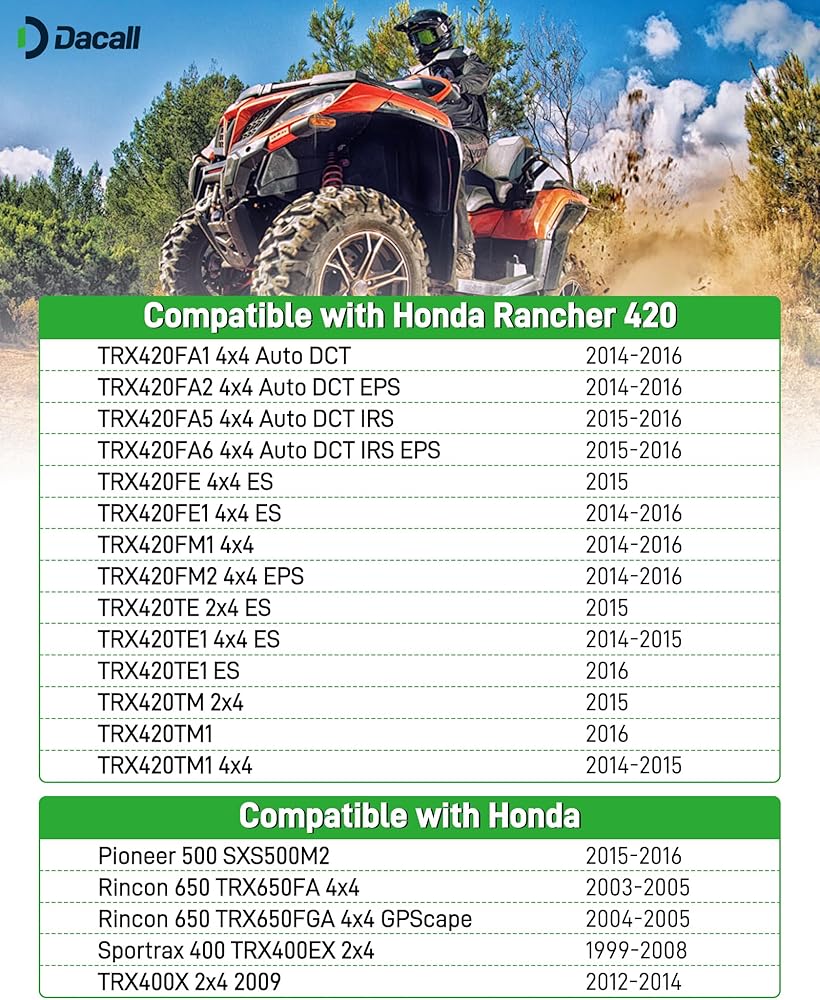 - Fit for Honda Rancher 420: Compatible with TRX420FA1 4x4 Auto DCT (2014-2016), TRX420FA2 4x4 Auto DCT EPS (2014-2016), TRX420FA5 4x4 Auto DCT IRS (2015-2016), TRX420FA6 4x4 Auto DCT IRS EPS (2015-2016), TRX420FE 4x4 ES (2015), TRX420FE1 4x4 ES (2014-2016), TRX420FM1 4x4 (2014-2016), TRX420FM2 4x4 EPS (2014-2016), Honda Rancher 420 TRX420TE 2x4 ES (2015), TRX420TE1 4x4 ES (2014-2015), TRX420TE1 ES (2016), TRX420TM 2x4 (2015), TRX420TM1 (2016), TRX420TM1 4x4 (2014-2015).