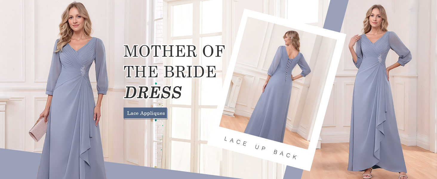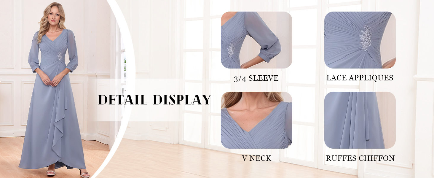 Features: 3/4 Sleeve Mother of The Bride Dress,Chiffon Mother of The Groom Dress,Lace Wedding Guest Dress,V Neck,A Line,Pleated,Ruffles,Ruched,Floor Length,Fully Lined,Lace up back,Built-in Bra.