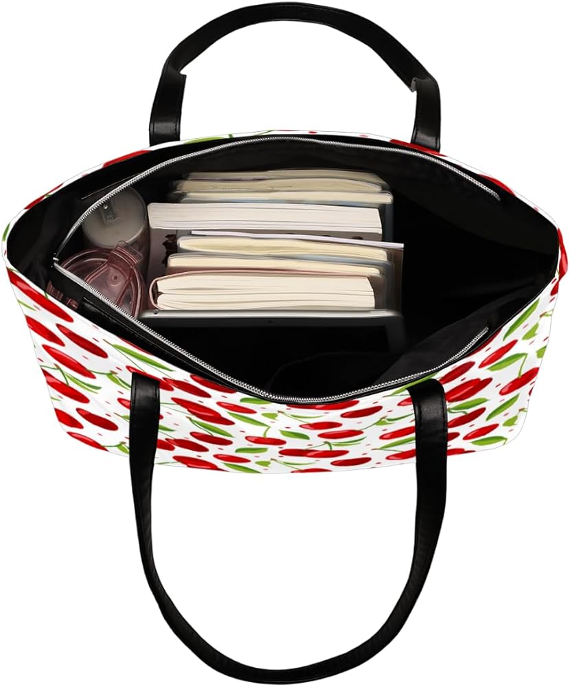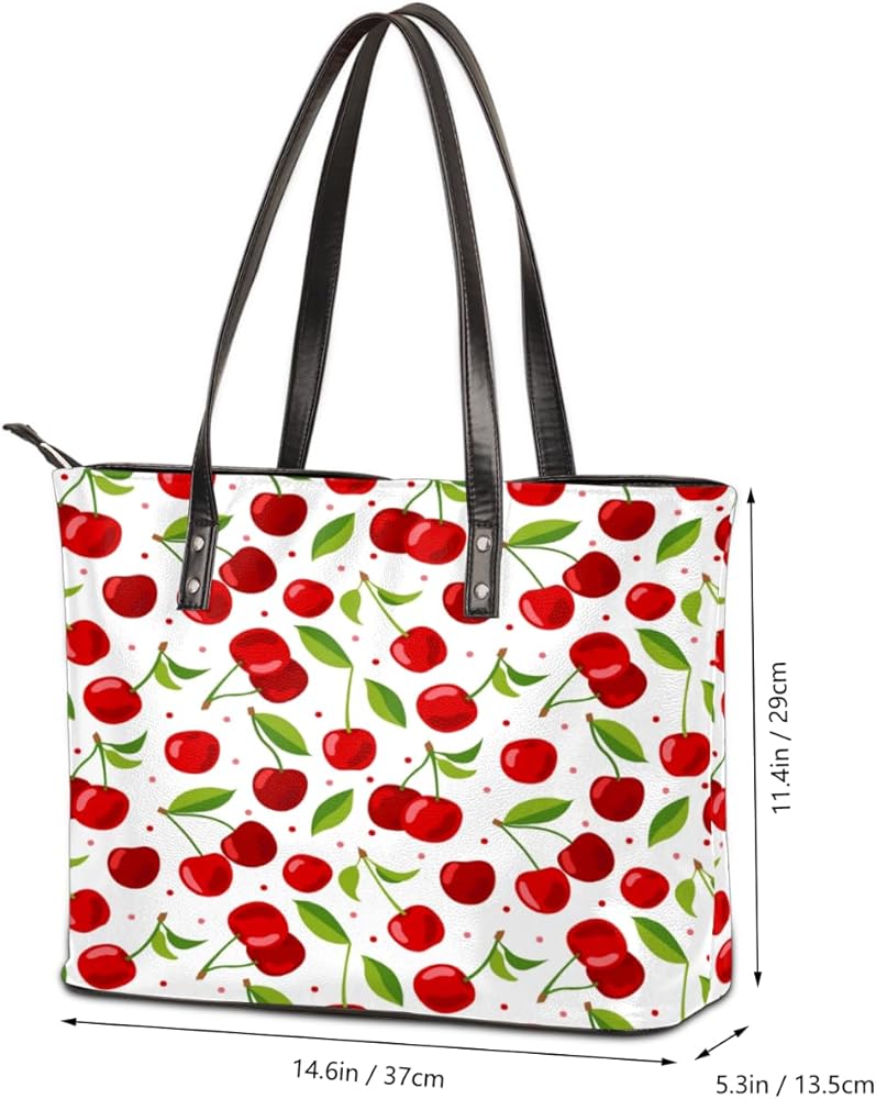 Fruit Cherry Pattern Tote Bag Women Shoulder Handbags PU Leather Everyday Bag with External Pocket Large Capacity Aesthetic Corduroy Tote Bag for Travel Work Party
