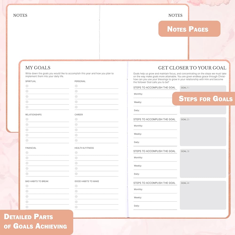 Multi-functional Designs - Upgrade your effeciency with our faith planner 2026, designed with thoughtful features to keep your life organized and efficient. Leather hardcover make it keep tidy + Pen holder to carry a pen easily + Back pocket to hold some cards + Elastic closure band + Bookmark ribbon to mark the place and find it quickly+ Round arc corner prevent cornor folds. With this 2026 christian planner, your life will be more productive.