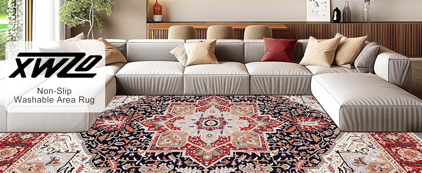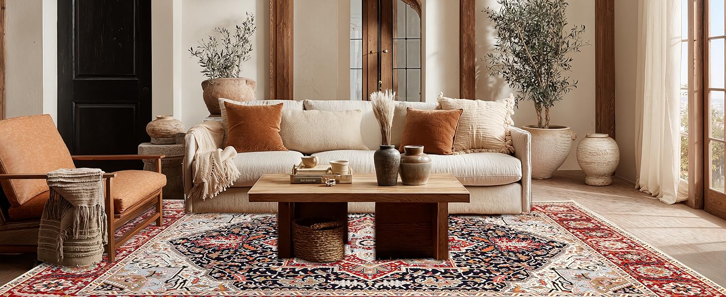 【Vintage Pattern】The large area rug showcases a timeless retro-inspired design with rich color variations. It adds an artistic and classic touch to your home while blending effortlessly with various interior styles.