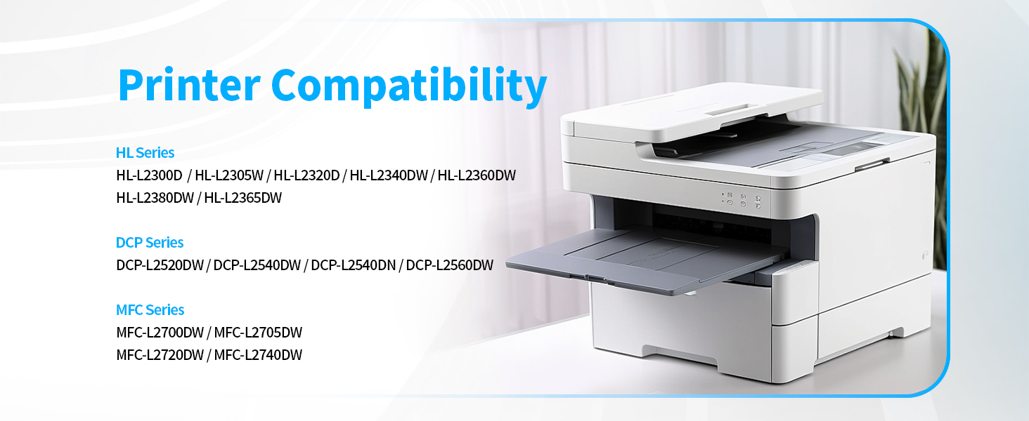 - Compatible Printers: HL-L2300D HL-L2365DW HL-L2340DW HL-L2320D HL-L2360DW HL-L2380DW HL-L2360DN HL-L2300DR HL-L2340DWR HL-L2360DNR HL-L2365DWR DCP-L2500D DCP-L2520DW DCP-L2540DN DCP-L2520D DCP-L2540DW DCP-L2560DW DCP-L2500DR DCP-L2520DWR DCP-L2540DNR DCP-L2560DWR MFC-L2700D MFC-L2700DW MFC-L2720DW MFC-L2740DW MFC-L2740DWR MFC-L2720DWR MFC-L2700DWR