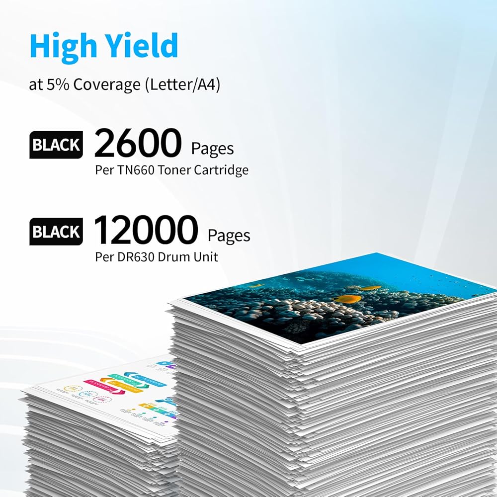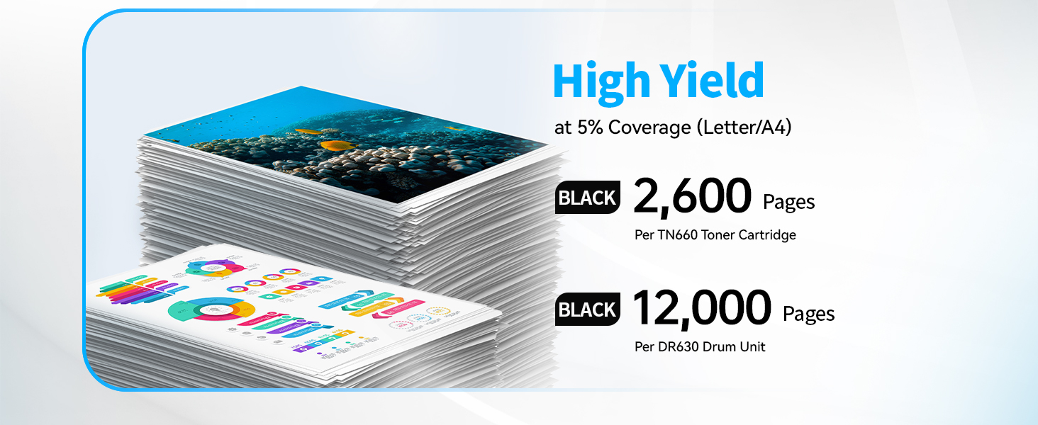 - High Page Yield: Up to 2,600 Pages per Black TN-660 Printer Toner Cartridges and 12,000 Pages per DR-630 Drum Unit