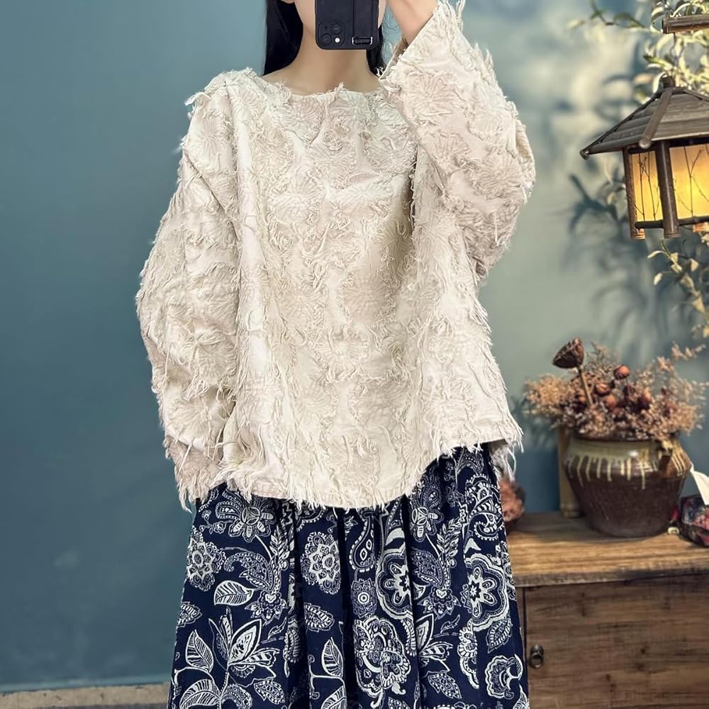 Women's Blouse Frayed Trim Long Sleeve Round Neck Loose Tee Tops