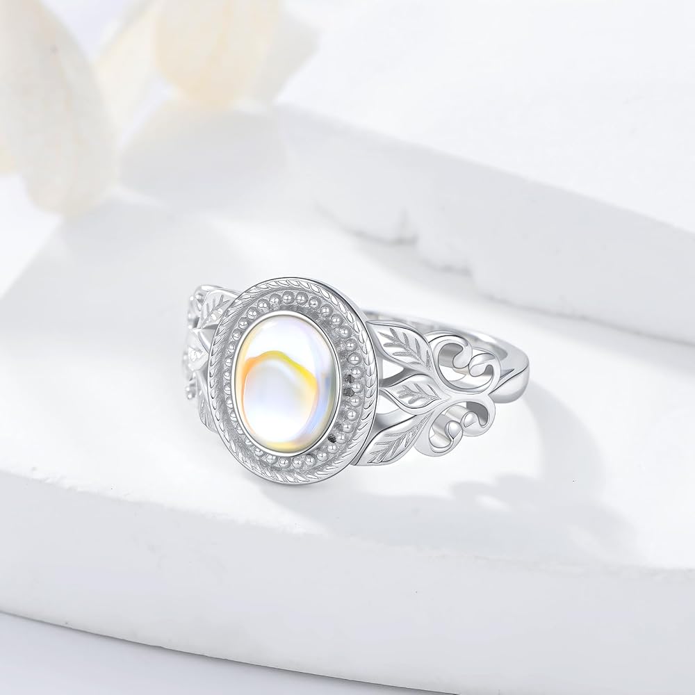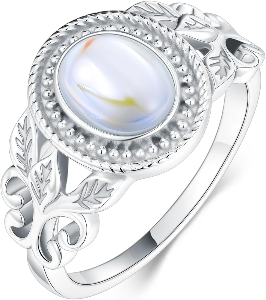 Moonstone Victorian Ring for Women, 925 Sterling Silver Rainbow Moon Stone Engagement Rings 6 * 8mm Oval Solitaire Vintage Leaf Ring Fine Jewelry Gifts for Her Mom