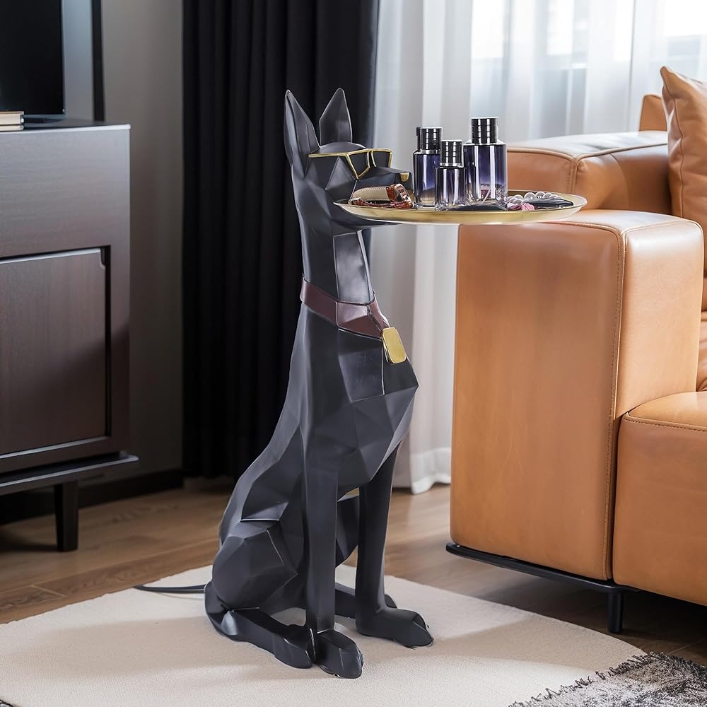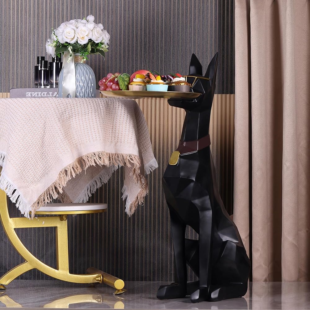 Artistic Geometric Butler Statue: This butler statue with serving tray doubles as a geometric dog sculpture, merging art and functionality. As an animal table, it brings modern elegance to your space—ideal for those who love modern sculptures and statues with a pet - friendly twist. Resin & Stable Structure: Made from durable resin, this animal side table resists water and corrosion. The robust base ensures it stays stable, whether used as an animal end table for bedside essentials or a dog tray table for hosting guests—built to withstand daily use. Multi - Use Detachable Tray: The metal tray turns this butler statue with tray into a versatile hub. Use it as a dog accent table for drinks in the living room, an animal coffee table for snacks, or a storage solution for small items—perfect for maximizing space in any room. Statement Floor Sculpture & Decor: Standing tall as a floor sculpture, this dog butler statue is a focal point in entryways, offices, or living rooms. Its modern design complements modern sculptures and statues collections while adding a whimsical “pet butler” touch to your decor. Thoughtful Gift for Creative Spaces: This animal table - meets - butler statue piece is a unique gift for design enthusiasts, pet lovers, or anyone wanting to elevate their space. Great for gifting on special occasions, it balances artistic flair with practical animal side table use.