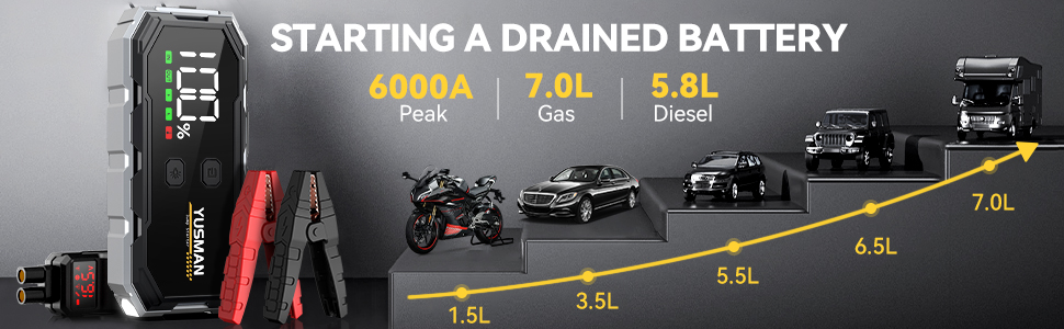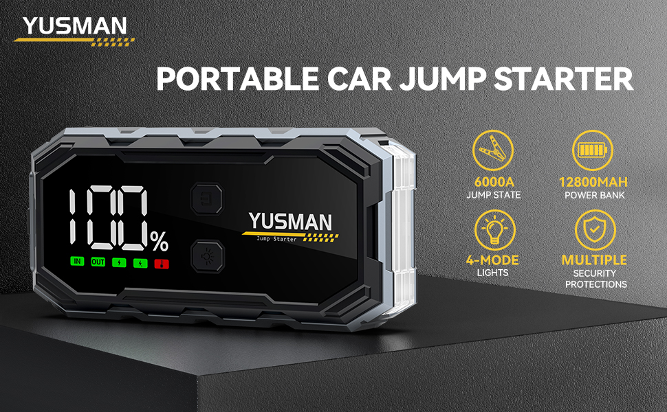 12800mAh POWER BANK: YUSMAN car jump starter built-in 4 high-capacity lightweight battery packs, and 3 USB charging ports, the battery jumper starter portable also works as a long-lasting power bank. The fast-charge USB port can fully charge your cellphones, tablets, and other mobile devices at the fastest speed possible.
