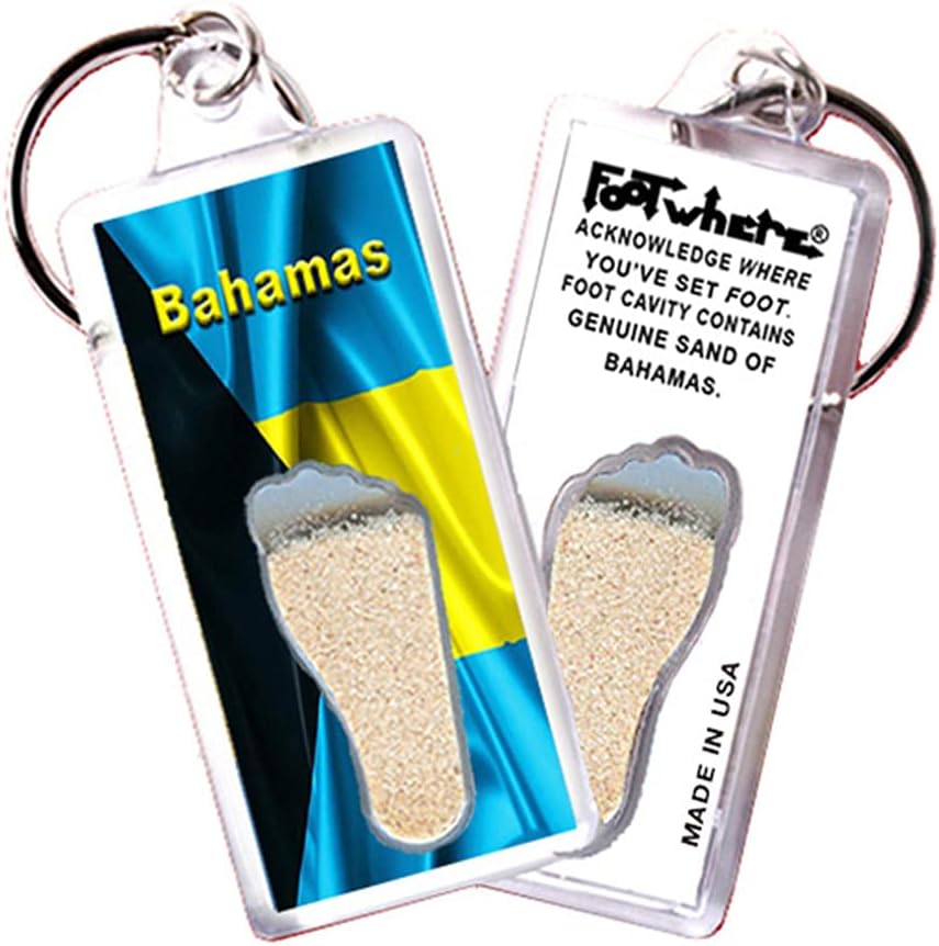 FootWhere Bahamas Souvenir Keychains. 6 Piece Set. Authentic destination souvenir acknowledging where you've set foot. Genuine sand of Bahamas encased inside foot cavity. Made in USA