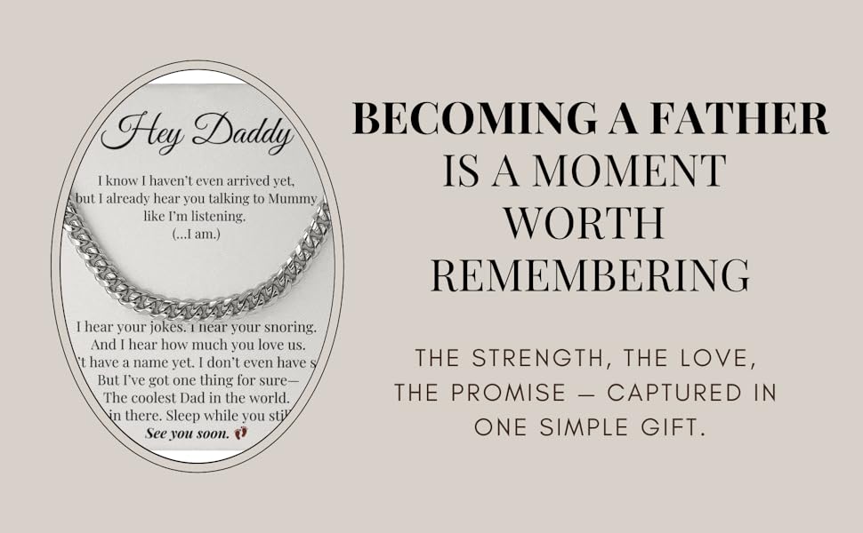 🎁 Gift-Ready Packaging That Creates a Moment He'll Never Forget Forget generic gifts—this one hits different. Each necklace arrives in a luxury gift box, cushioned to protect the chain and paired with a printed message card that carries all the emotions you wish you could say. You don't need fancy wrapping or over-the-top speech. The moment he lifts the lid and reads those words—he'll know. Whether it's for a baby shower, a gender reveal, the moment you tell him “we're pregnant,” or his first Father's Day, this box transforms into an experience, not just a product.
