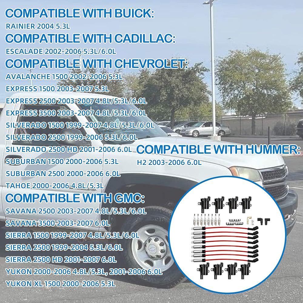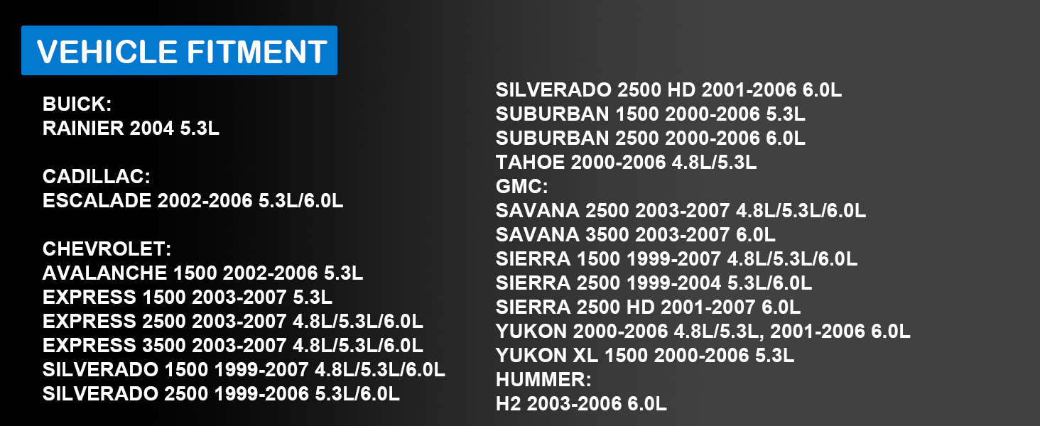 - COMPATIBLE WITH CHEVY:2002-2006 Chevy Avalanche 1500 5.3L;2003-2007 Chevy Express 1500 5.3L;2003-2007 Chevy Express 2500 4.8L 5.3L 6.0L;2003-2007 Chevy Express 3500 4.8L 5.3L 6.0L;1999-2006 Chevy Silverado 1500 4.8L 5.3L 6.0L;1999-2006 Chevy Silverado 2500 5.3L 6.0L;2001-2006 Chevy Silverado 2500 HD 6.0L;2001-2007 Chevy Silverado 1500 HD 6.0L;1999-2004 Chevy Silverado 2500 6.0L;2001-2006 Chevy Silverado 2500 HD 6.0L;2001-2006 Chevy Silverado 3500 6.0L;2000-2006 Chevy Suburban 1500 5.3L;2000-2006 Chevy Suburban 2500 6.0L;2000-2006 Chevy Tahoe 4.8L 5.3L