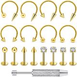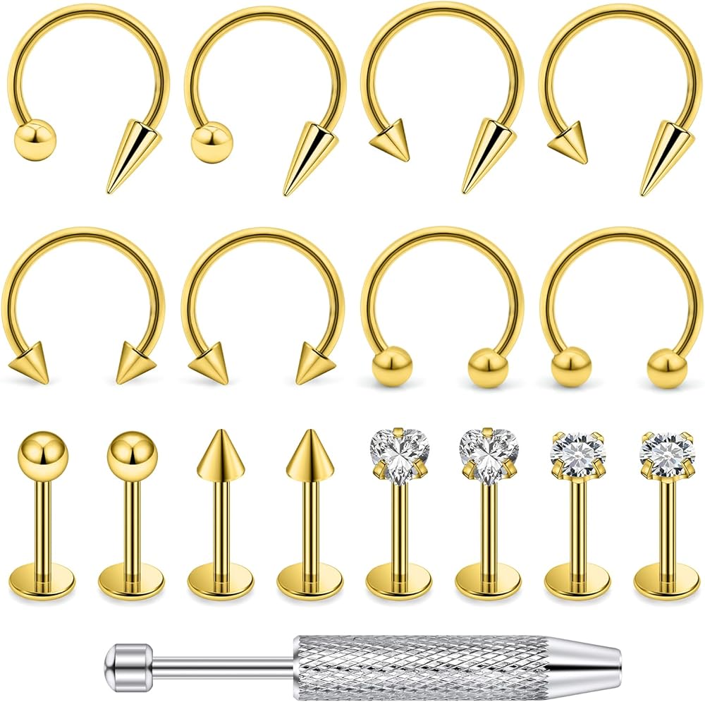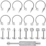 VALUE MIXED SET: One Order Includes 4 Pairs of Labret Studs and 4 Pairs of Horseshoe Lip Rings Featuring Shiny Balls, Spike Tops, and Clear Round CZ Designs. Externally Threaded Tops With Smooth Flat Back for Secure and Comfortable Wear. Comes With a Velvet Pouch for Storage or Gifting. Plus 1Pc Piercing Ball Grabber Tool.