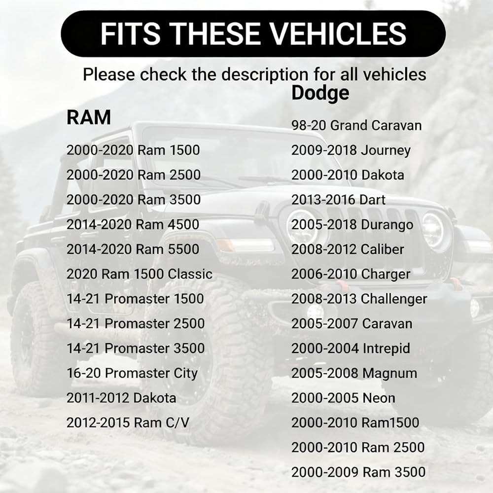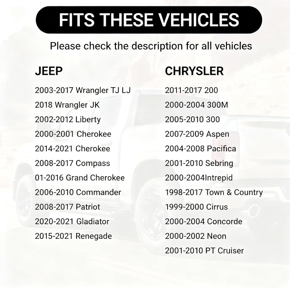 Compatible with: 2000-2017 Cherokee 2008-2018 Compass 2006-2010 Commander 2008-2018 Patriot 2003-2018 JK 2003-2006 TJ 2002-2012 Liberty 2001-2019 Grand Cherokee