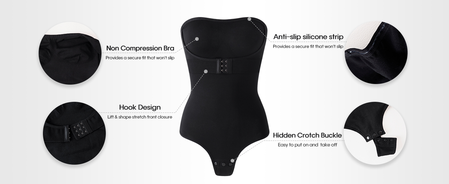 【Non-Slip Silicone & Button Design】 The strapless bodysuit shapewear thong includes anti-slip silicone to prevent sliding. As shapewear strapless bodysuit and shapewear bodysuit strapless, it stays secure all day. The convenient crotch button design improves wearability. Ideal for shapewear for dresses and shape wear for under dress, it keeps your look seamless and smooth.