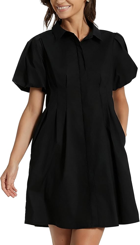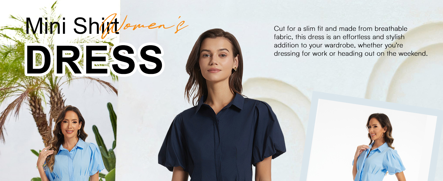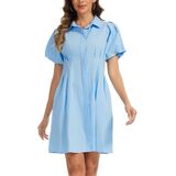 Features: This summer casual shift mini dress features in a collar v-neck, short puffed sleeves, a pleated waist, closed buttons, and a length above the knees. Suitable for wearing on any occasion.