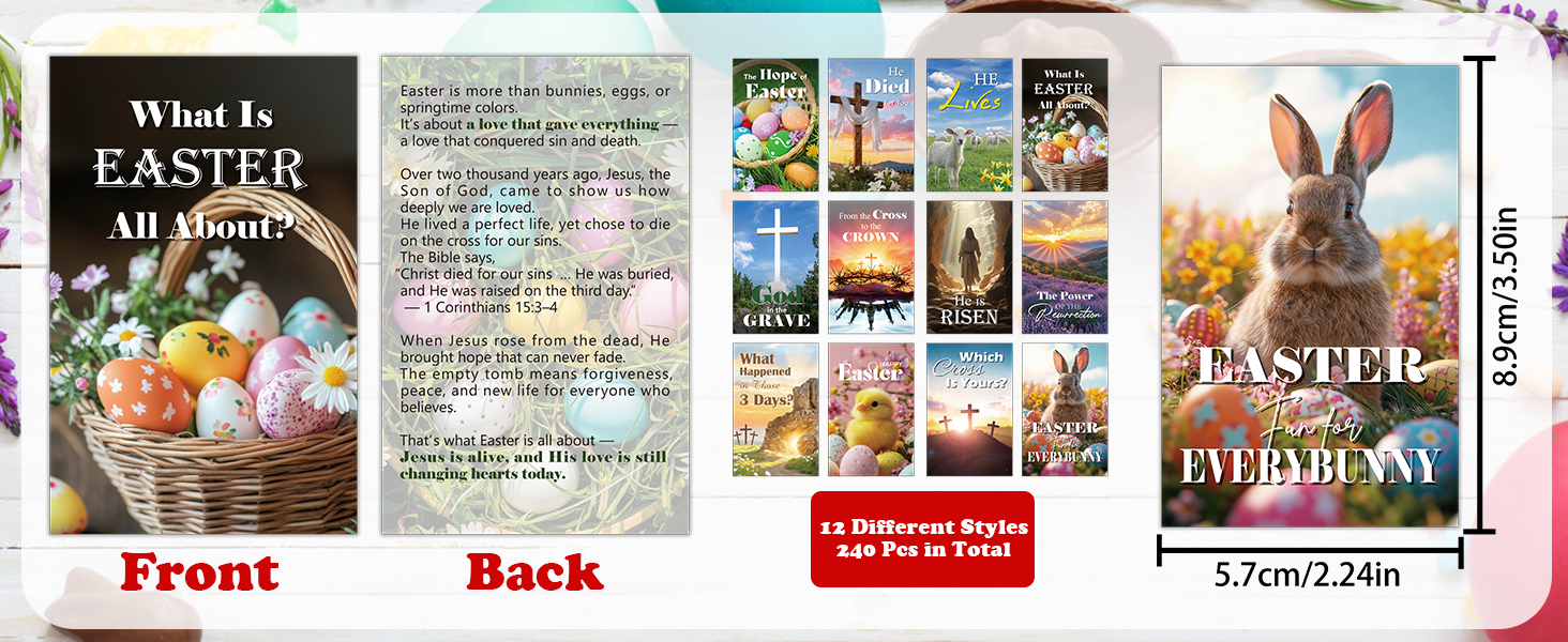 Bulk Pack for Church Use: Twelve designs with twenty pieces each for a total of 240 gospel cards; packed in four stacked sets with total height under 1.8 cm; ideal for Easter services Bible study groups and ministry outreach