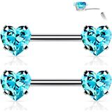 316L Surgical Steel 14G Nipple Barbell Threadless Push In Prong Set Blue Crystal Heart CZ Nipple Rings Bars Piercing Jewelry 1/2 Inch (12mm) - Sold As Pair