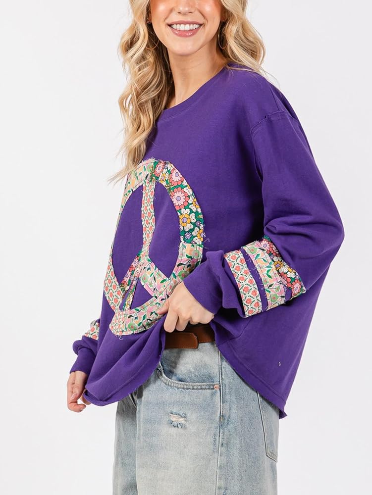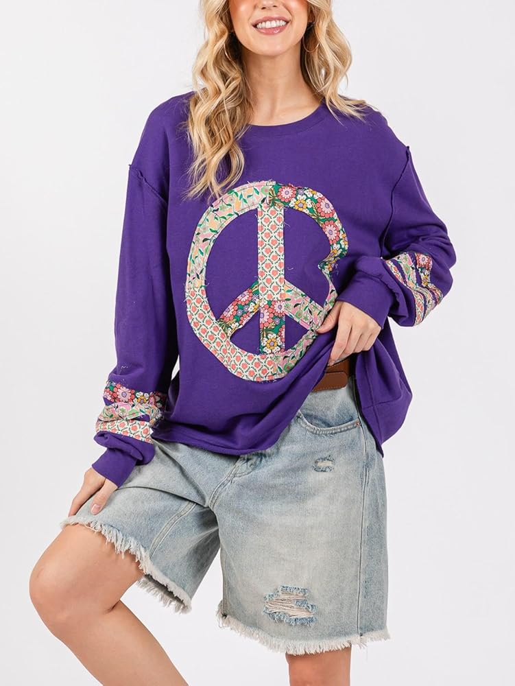 This long sleeve top features a peace applique patch for a touch of unique and playful style. The soft fabric and relaxed fit make it comfortable for all-day wear. Pair this top with your favorite jeans or leggings for a casual yet trendy look.