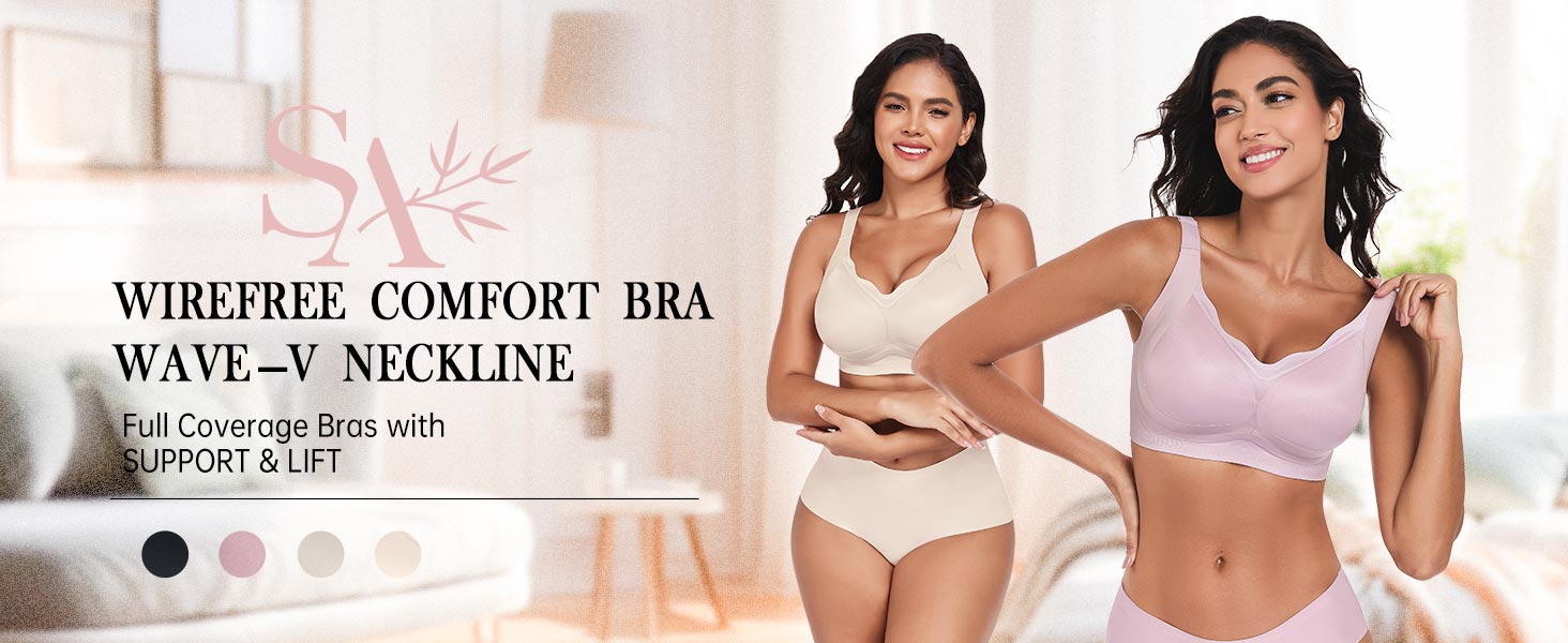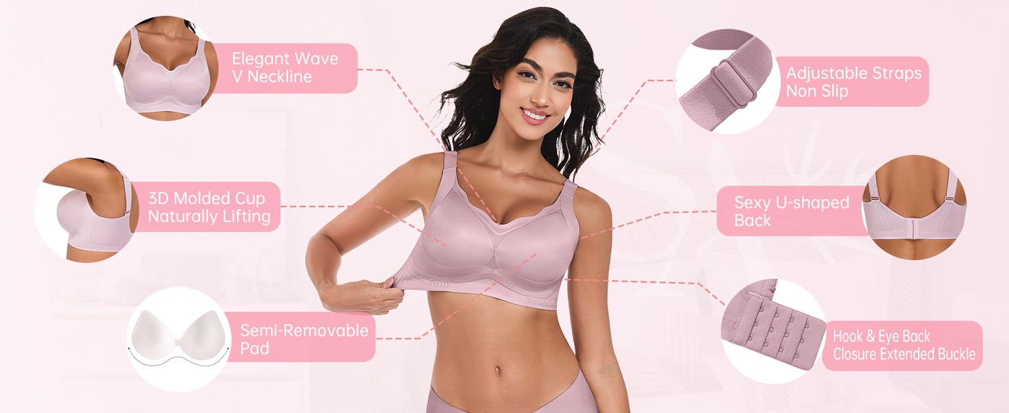 【Soft Supportive bras with Jelly Strip】The V neck Bras Designed with no wire to provide a natural relaxed fit while offering great support through 360° jelly band, ensuring all day comfort for women of all ages and all body types.This unique 3D support technology enhances your curves without underwire, offering a perky, rounded silhouette with anti-sagging confidence