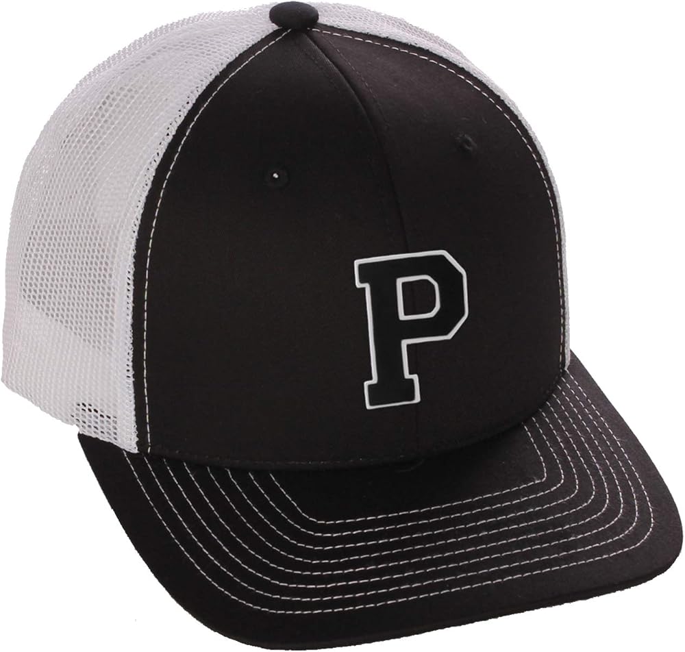 Team Sports Custom Inital Letter "P". Great for amateur baseball, soccer, football, softball, hockey, tennis or any other team sports. Double layered 3D raised PVC durable letters. Best Classic Cambridge Mesh Trucker Cap made with 6 panels, curved visor, and adjustable plastic snapback closure. Great quality and clean lines, made with 35% cotton and 65% polyester. Great updated fashionable baseball cap. Top quality, superior comfort, and fit adjustable trucker hat. Perfect hat for deaily wear, this cap will protect your skin from the strong summer sun and make you look great at the same time. Invest on this well made hat with quality fabric. The fabric won't fray or fade even with daily use. These cap will become your favorite accessory. Perfect for outdoors or indoors hat. Available in a variety of fashionable colors.