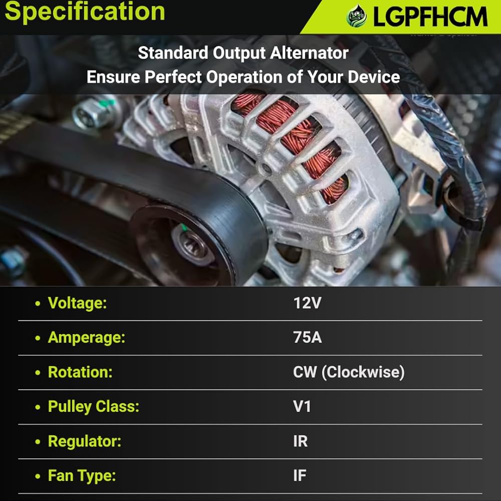 Specification: Unit Type: Alternator / Voltage: 12 / Rotation: CW / Amperage: 75A / Clock: 12 / Pulley Class: V1 / Regulator: IR / Fan Type: IF