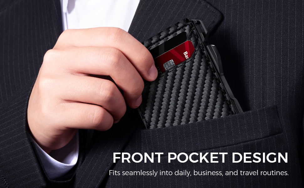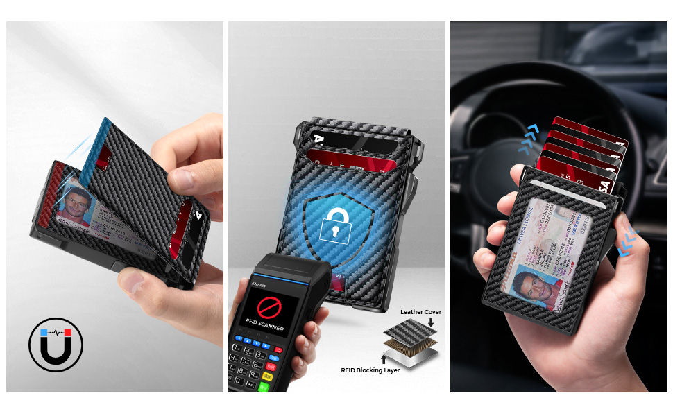 QUICK ACCESS: Unlike traditional wallets, this card holder features a precision pop-up mechanism. Press the side button—cards fan out in a step pattern for instant access. Tested for 10,000+ presses. No pinching, no fumbling.