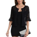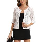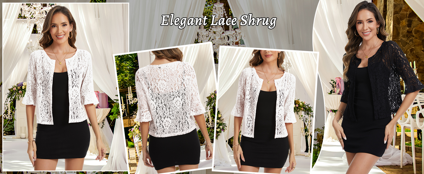 【ELEGANT DESIGN WITH FEMININE DETAILS】Elevate any outfit with this womens lace cropped cardigans, featuring delicate floral lace pattern, charming 3/4 ruffle sleeves, and an open front silhouette. The intricate lace texture adds dimension and visual interest, creating a lace sheer shrugs for dresses that strikes the perfect balance between playful and sophisticated.