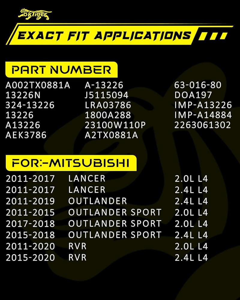 Fitment: Compatible with Mitsubishi Lancer 2011-2017 2.0l l4; Lancer 2011-2017 2.4l l4; Outlander 2011-2019 2.4l l4; Outlander Sport 2011-2015 2.0l l4; Outlander Sport 2017-2018 2.0l l4; Outlander Sport 2015-2018 2.4l l4; RVR 2011-2020 2.0l l4; RVR 2015-2020 2.4l l4