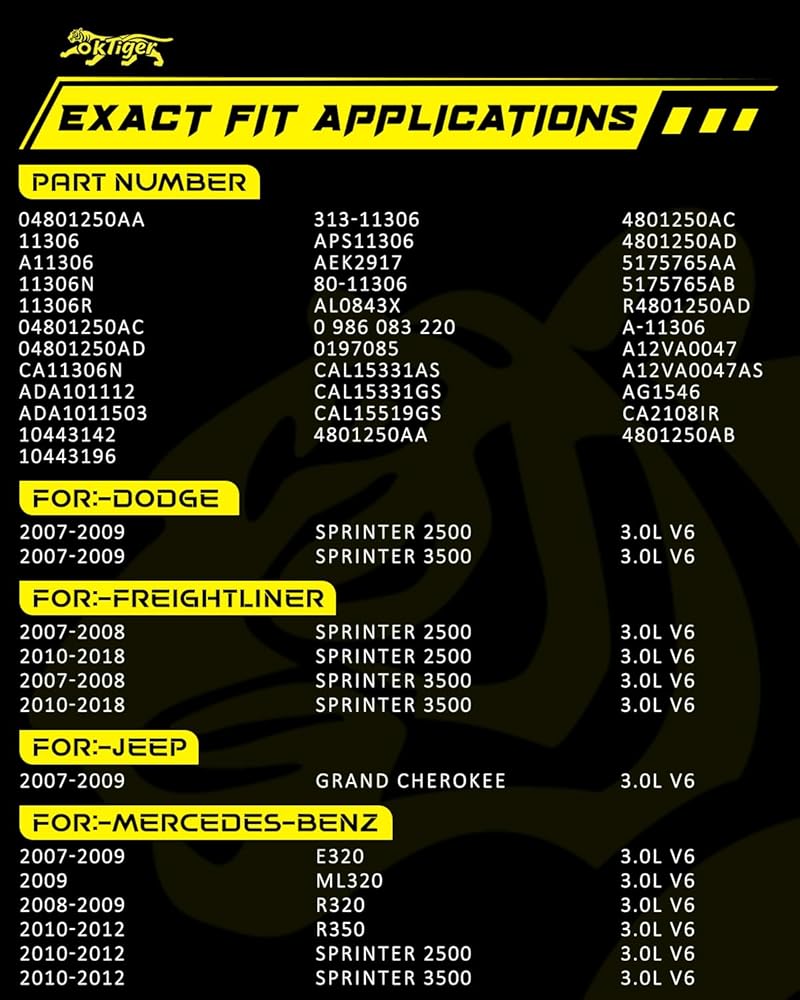 Fitment: Compatible with Sprinter 2500 2007-2018 3.0l v6 diesel, Sprinter 3500 2007-2018 3.0l v6 diesel, fit for Mercedes-Benz for Freightliner for Dodge, for Mercedes-Benz E320 2007-2009 3.0l v6 diesel, Ml320 2009 3.0l v6 diesel, R320 2008-2009 3.0l v6 diesel, R350 2010-2012 3.0l v6 diesel, for Jeep Grand Cherokee 2007-2009 3.0l v6 diesel