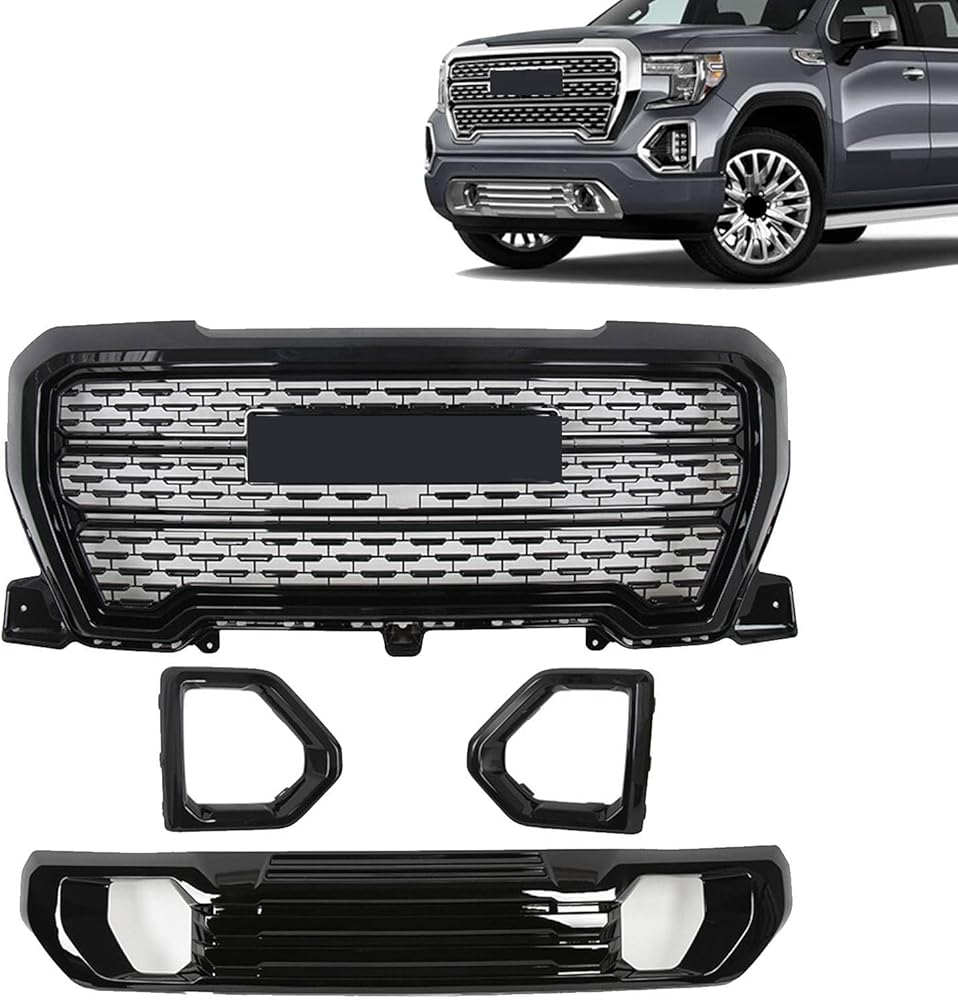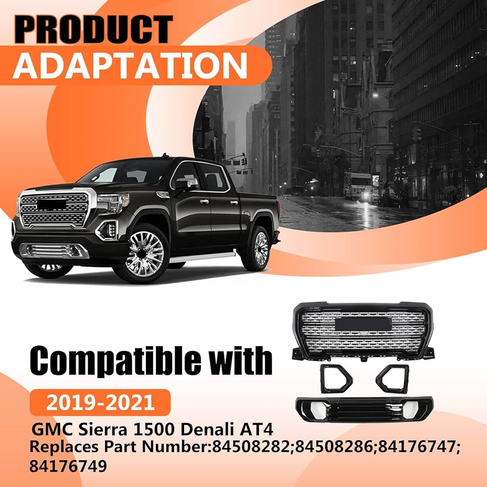 JX RACING Grille Set 4pcs Compatible with GMC Sierra 1500 Denali AT4 2019-2022 Front Upper Grill + Front Lower Bumper Filler Grille Trim Plate + Fog Light Bezels Cover 84508282 84508286 84176747