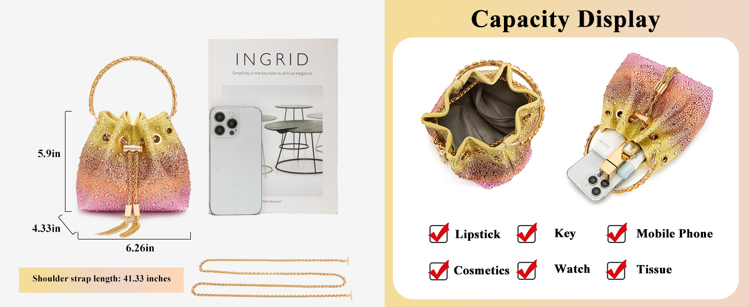Shine at every event with our Evening Clutch Bag—the perfect gift for Thanksgiving, Christmas, Valentine's Day, birthdays, graduations, and beyond. Interior : Zipper patch pocket Hardness : Slightly firm Pattern Type : Sparkly Rhinestone Style : Casual Decoration : Chain Lining Material : Polyester Shape : Bucket Color: Pink, Gold, Silver, Red