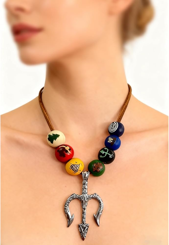 - The necklace consists of a brown cord with eight colorful wooden beads and a ring charm in the middle.