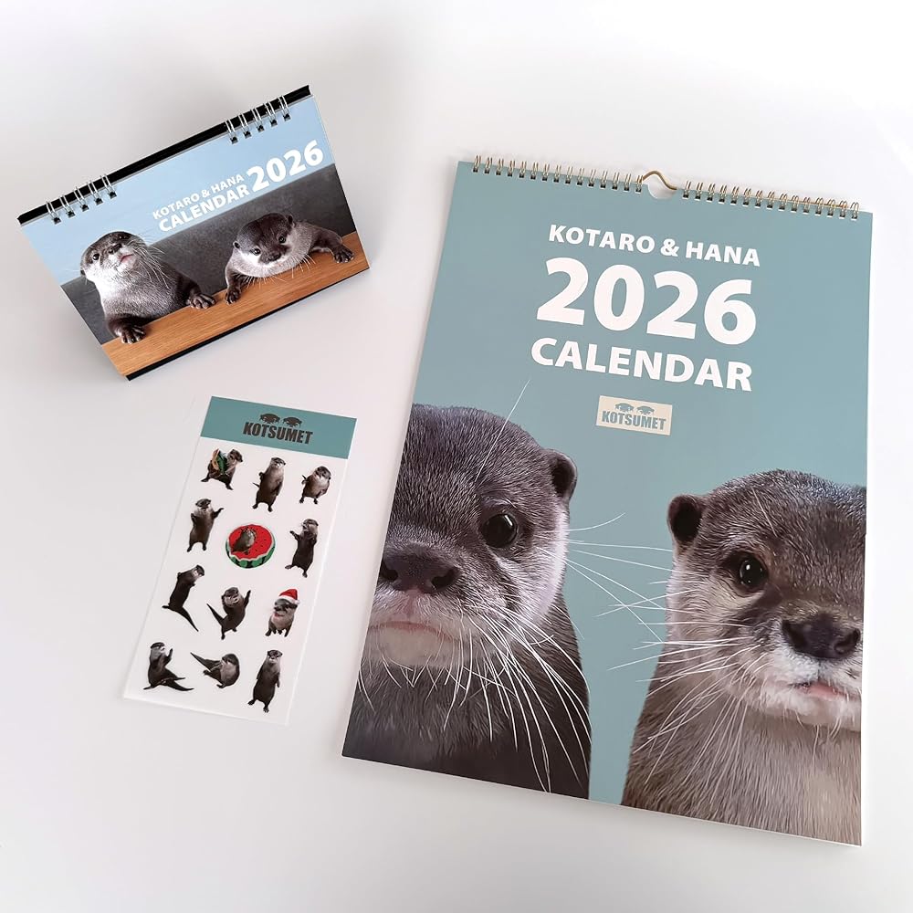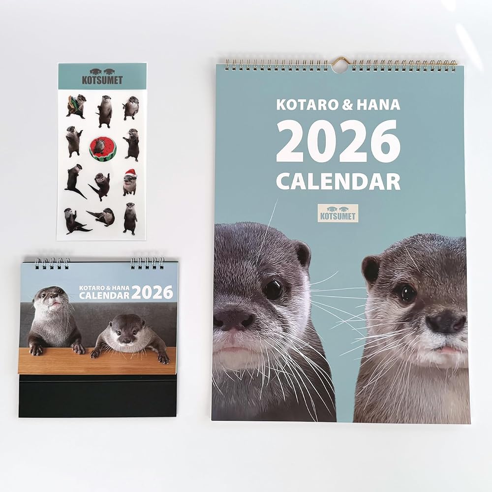 This 2026 calendar set features the adorable otters Kotaro and Hana, including a wall calendar and a desk calendar.