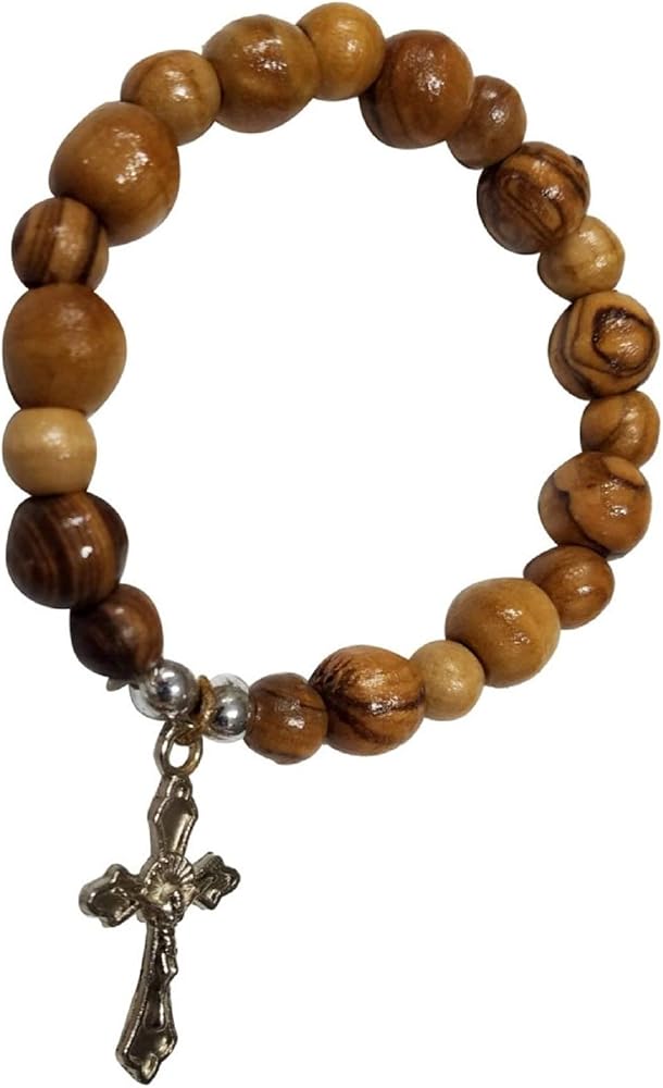 Exceptional rosary bracelet that is hand crafted in Bethlehem with olive wood assorted round beads, and silver crucifix. Made with great attention to details and the word Jerusalem engraved on the back of the cross. Size: 5 inches.