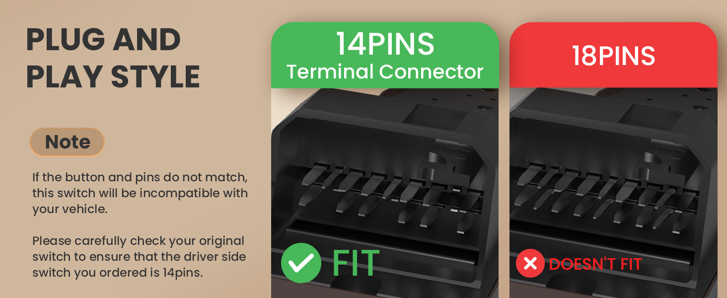 【Easy Plug and Play Installation】Features 14 pins terminal connector for simple plug and play installation. This driver side window switch can be installed in minutes without special tools. Just remove and replace your old power window switch.