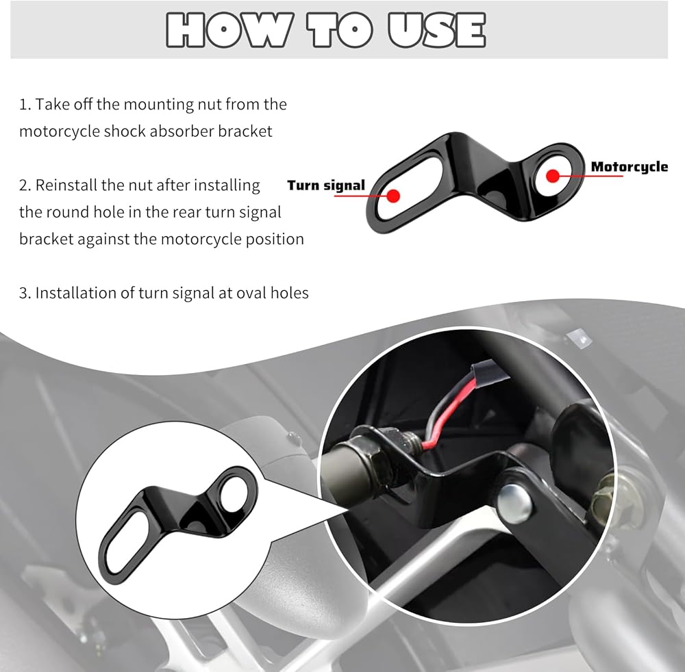 Usage: No complicated steps to use, do-it-yourself installation. 1. Take off the mounting nut from the motorcycle shock absorber bracket 2. Reinstall the nut after installing the round hole in the rear turn signal bracket against the motorcycle position. 3. Installation of turn signal at oval holes