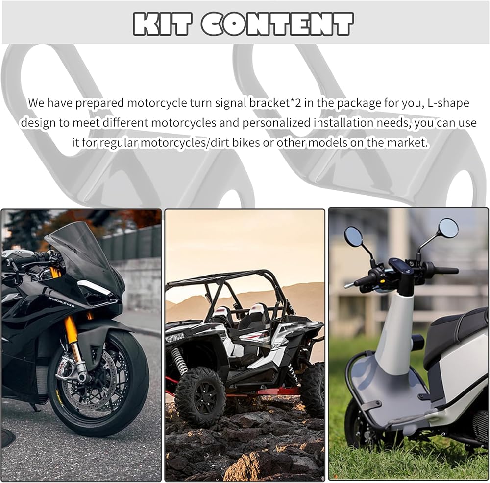 Kit Content: We have prepared motorcycle turn signal bracket*2 in the package for you, L-shape design to meet different motorcycles and personalized installation needs, you can use it for regular motorcycles/dirt bikes or other models on the market