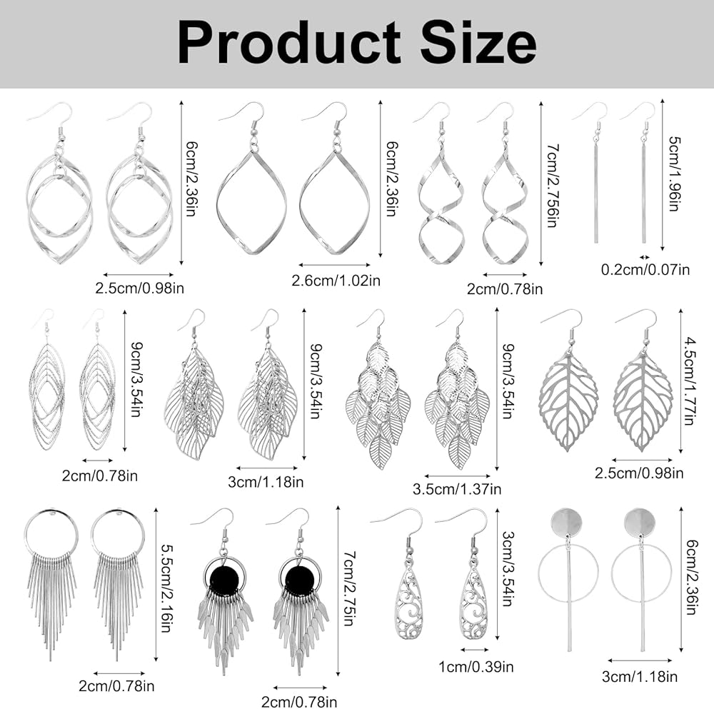 You will receive a stylish silver dangle earrings set, consisting of 12 different styles. Each item is uniquely designed and the fringed design is an excellent way to showcase your charm. The colors are bright and vivid, the appearance is charming, and it is easy to use. It offers classic colors that meet all your needs, is easy to wear and remove, is made of reliable quality materials, does not cause any burden, does not fade, damage or deform. It is lightweight and portable, and can be used repeatedly for a long time.