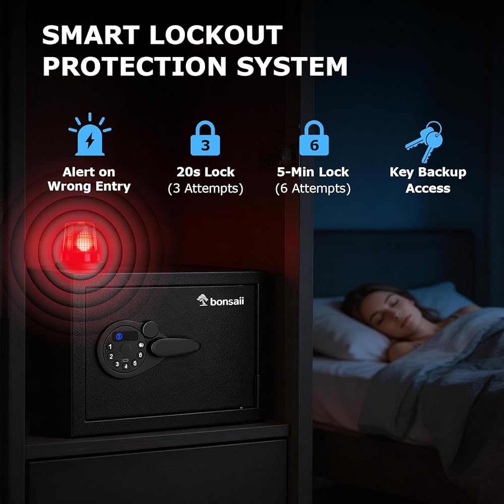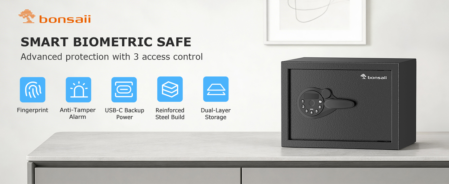 Triple Access: Fingerprint + Passcode + Key;Biometric safe with 3 unlock ways: 0.5s fast fingerprint, customizable digital keypad and 2 emergency keys. Convenient keyless entry safe for home and business.