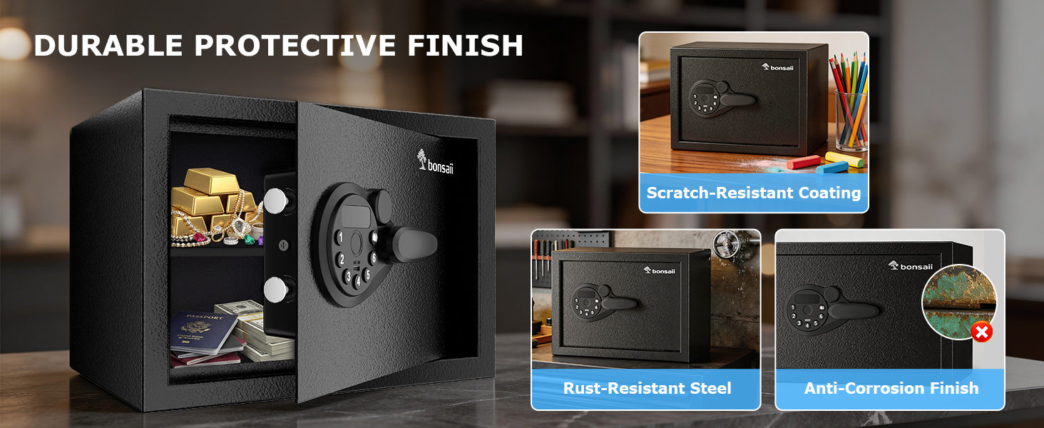 Reinforced Steel Security:SPCC steel safe box with 18mm solid locking bolts, pry-resistant anti-theft door and scratch-resistant coating. Delivers long-lasting protection against forced entry.
