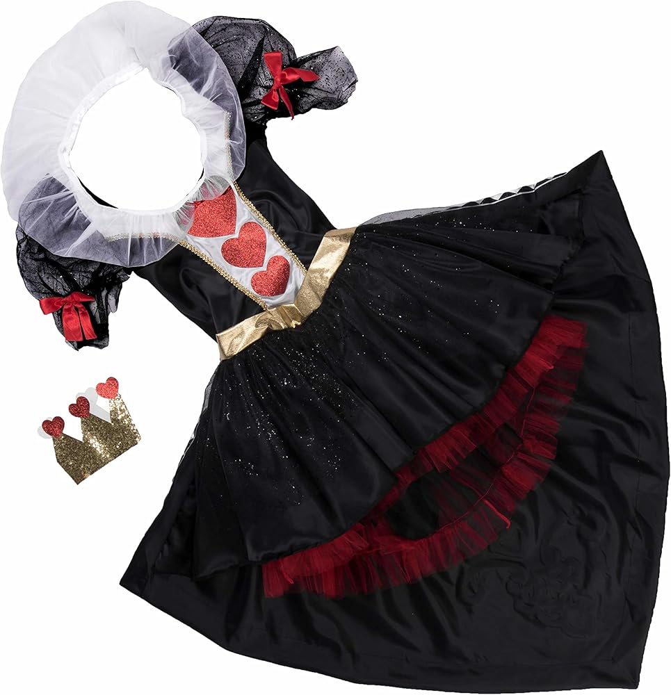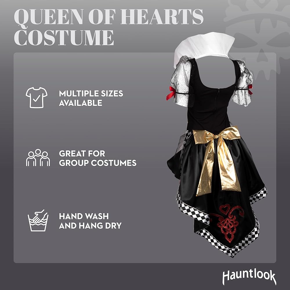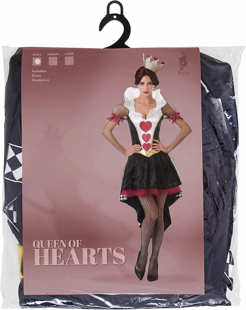 Her royal card suit: Includes one dress and a crown headpiece. Fishnets not included. See Hauntlook's fishnet tights for a sexy twist on this classic villainess costume