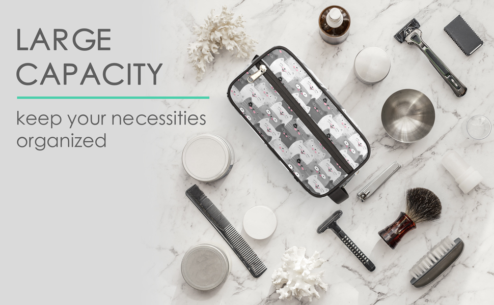 【Large Size】10.5 x 4.4 x 5.3 inch. The shaving bag is equipped with one main compartment and one front pocket neatly organized your large/small skin-care products, cosmetics,electric shaver, travel shampoo, toothbrushes and other items you need. cosmetics,electric shaver, travel shampoo, toothbrushes and other items you need.