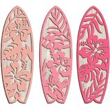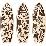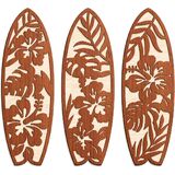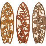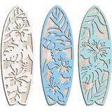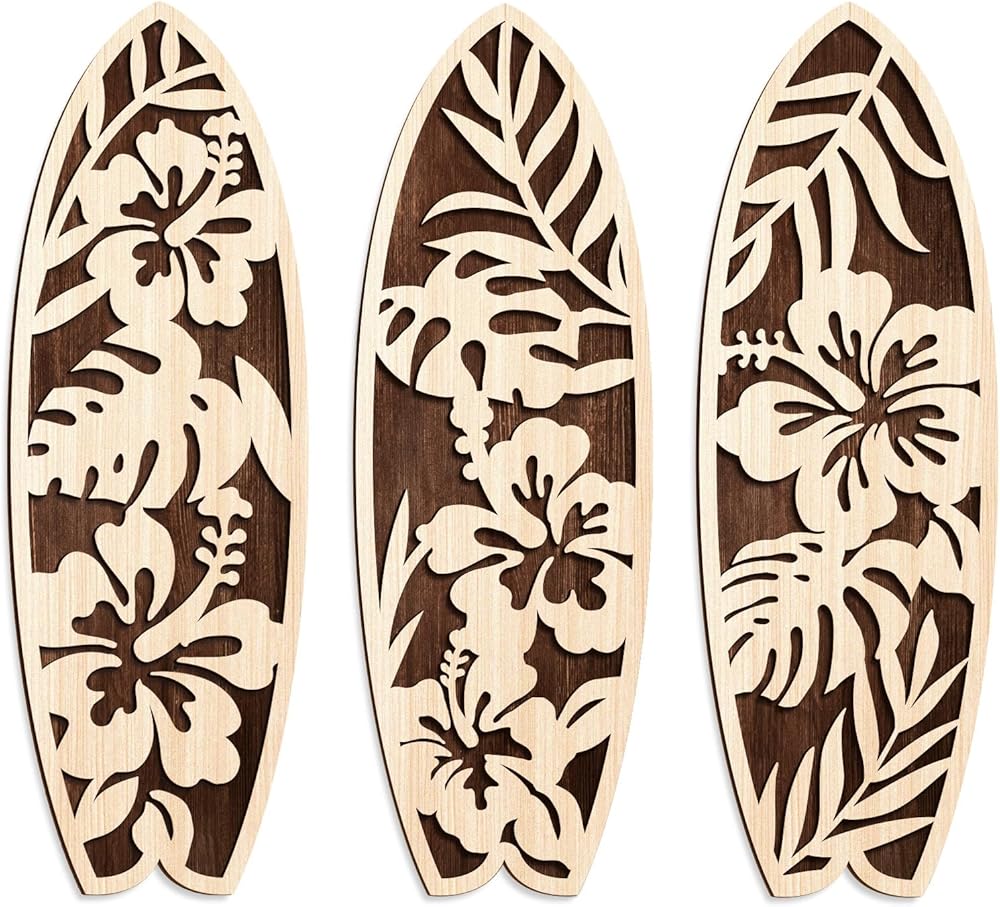 Transform your space with this charming set of three wooden surfboard wall decorations featuring beautiful Hawaiian-inspired designs. Each surfboard showcases intricately carved tropical patterns with hibiscus flowers and monstera leaves, creating stunning visual contrast against the natural wood background. The set includes three distinct designs in white, light blue, and mint colors, each measuring 4 inches long by 12 inches wide - perfect for creating an eye-catching wall display. These decorative pieces are expertly crafted with precise cutouts that highlight the natural wood grain texture beneath the colored overlays. The lightweight construction makes them easy to mount, ideal for adding a touch of coastal charm to any room. Whether arranged in your bedroom, living room, or any space needing a splash of summer vibes, these surfboard wall hangings bring dimension and beachy character to your decor. The classic surf-inspired design complements both modern and coastal interior styles, making it a versatile addition to your home's aesthetic. Create your own tropical paradise with this artfully designed wall decor set that captures the essence of laid-back beach life.