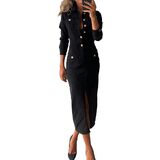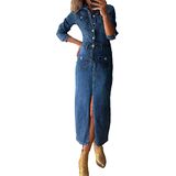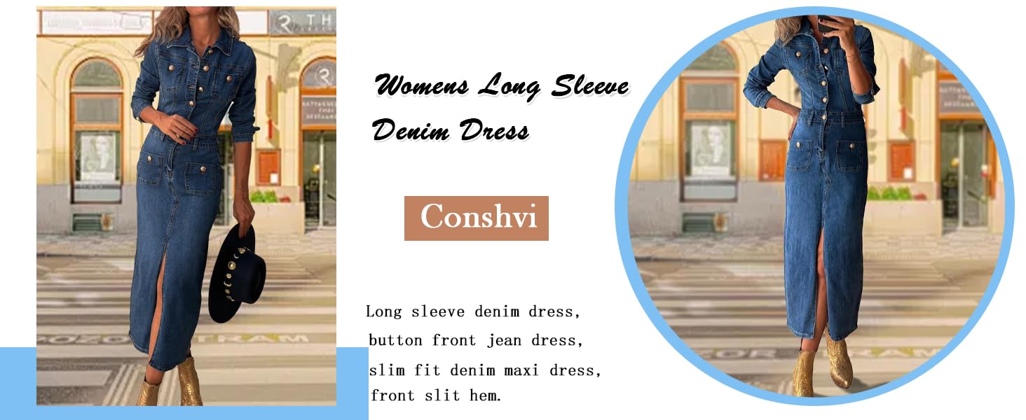 【Features】Long sleeve denim dress, button front denim dress, slim fitted denim maxi dress, a high waistline just below the bust and front slit hem add a stylish edge to this knee-length dress. Button front denim dress, casual trendy denim dress for women.