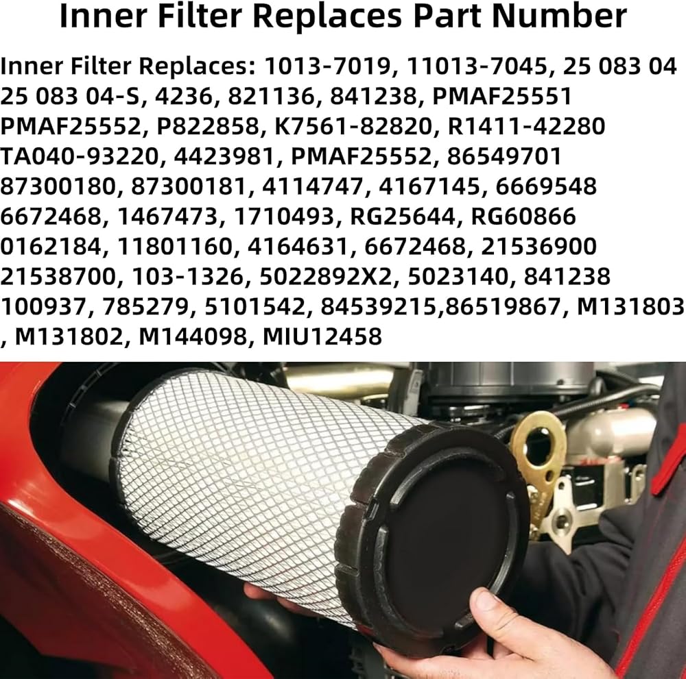 - Replaces Part Number: Outer Filter Replaces 11013-7044 11013-7020, 25 083 01 25 083 01-S, M131802 M164264 M170281 MIU12457 M144100, 841237 841497, P821575, AF25551. Inner Air Filter Replace 25 083 04, 25 083 04-S, 11013-7019, 11013-7045, P822858, M131803 MIU12458 M144098, AF25552, 821136 841238