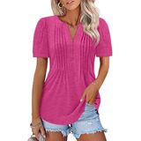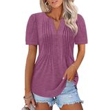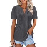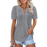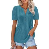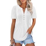 TICTICMISS Women's Pleated V Neck T Shirts Puff Short Sleeve Tops Henley Business Casual Summer Blouses