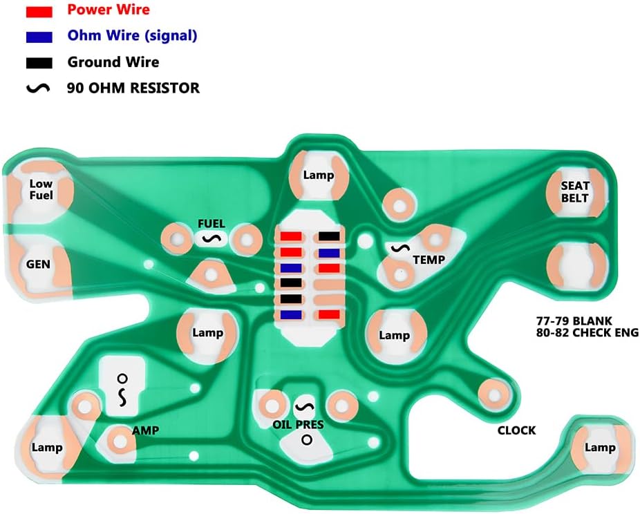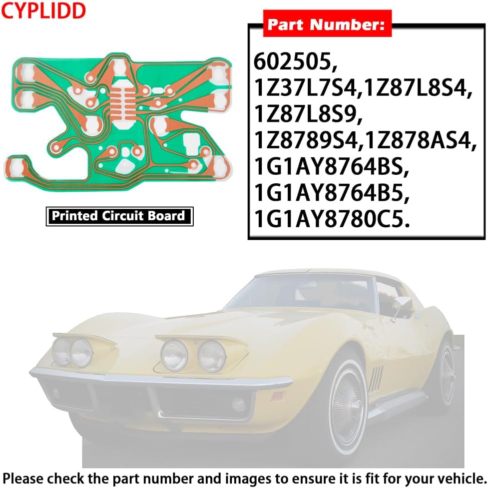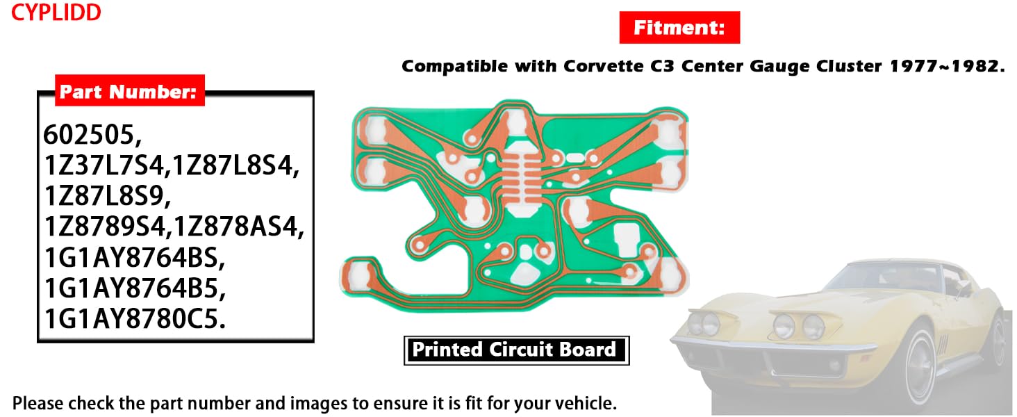 The circuit board compatible with Corvette C3 speedometer and tachometer cluster,The VIN Range as follows: 1977 Corvette VIN:1Z37L7S400001 to 1Z37L7S449213, 1978 Corvette VIN:1Z87L8S400001 to 1Z87L8S440274, 1978 Corvette VIN:1Z87L8S900001 to 1Z87L8S906502 (Pace Car), 1979 Corvette VIN:1Z8789S400001 to 1Z8789S453807,