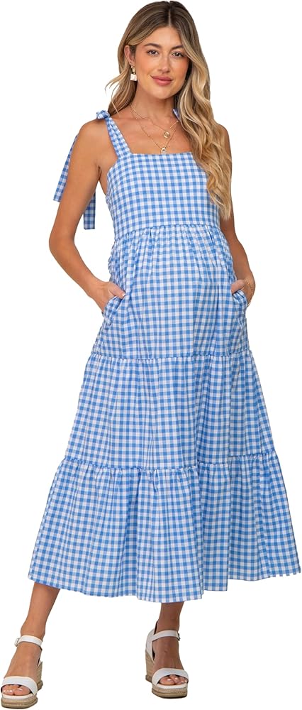 A sleeveless checkered print maternity maxi dress featuring self-tie shoulder straps, a smocked back, a tiered skirt, side pockets and a square neckline.