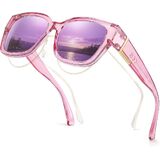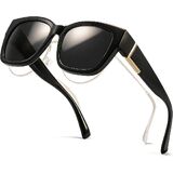 TRENDY SQUARE SHADES: A clean square silhouette paired with a subtle L-shaped metal detail on the temples adds a modern touch. These fit-over shades look sleek and stylish rather than bulky