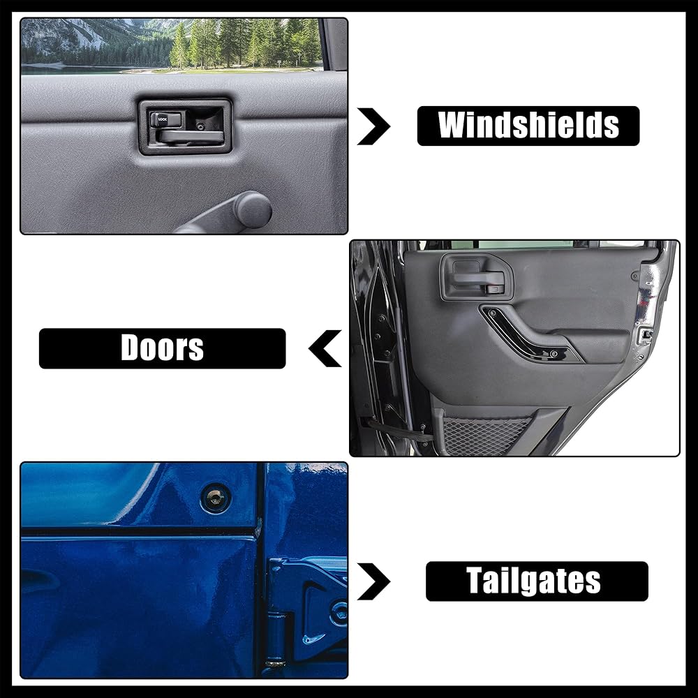 Convenient: Wide Application: Torx screw is suitable for Jeep Wrangler center console, windshield frame, windshield hinge, windshield tunnel, central control windshield, mirror mount, main body, speaker, climber hinge, door panel, door handle, door seals, door trim, door hinges, tailgate, tailgate vent covers, seats, hard door inserts, door belt brackets, door locks, tailgate hinges.