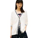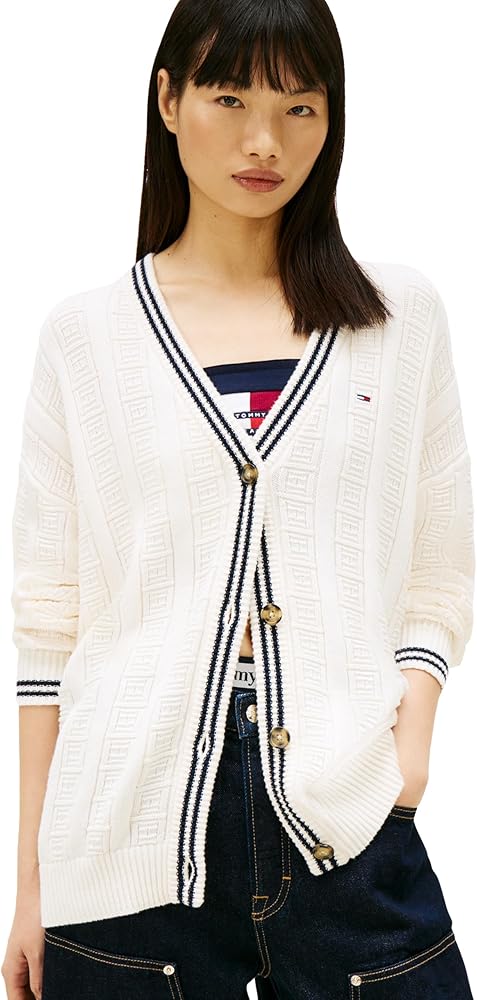 Introducing the Cotton Cable Cardigan with Knit Flag Print from Tommy Jeans, featuring the iconic knit flag print and button closure, crafted from 100% cotton for unparalleled comfort. Complete with knit flag print and button closure, this lounge cardigan offers both style and functionality. The soft construction ensures warmth without sacrificing breathability, making it perfect for everyday wear. With its relaxed silhouette, this cardigan sweater strikes the ideal balance between comfort and style, flattering the silhouette while providing ample room for movement. Pair it effortlessly with your favorite Tommy Hilfiger shirts, tees, shorts, pants, jeans, jackets, or coats for a versatile and timeless look suitable for any occasion, whether casual or formal. Whether you're heading out for a day of leisure or hitting the gym, this sweater is the ultimate go-to. Treat yourself or surprise a loved one with this versatile wardrobe staple, ideal for mothers, sisters, girlfriends, wives, daughters, or friends. Experience the unmatched quality and everyday style of Tommy Hilfiger with this must-have women's sweater.